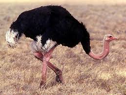 Contrary to popular belief, ostriches do not bury their heads in the sand. The old saw probably originates with one of the bird's defensive behaviours. At the approach of trouble, ostriches will lie low and press their long necks to the ground in an attempt to become less visible. Their plumage blends well with sandy soil and, from a distance, gives the appearance that they have buried their heads in the sand.